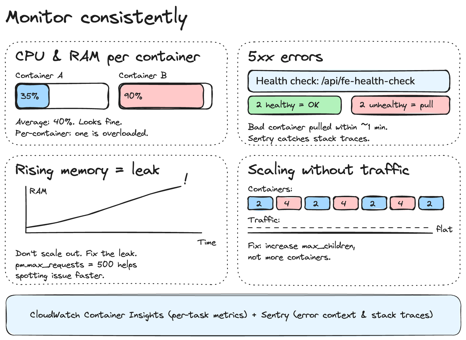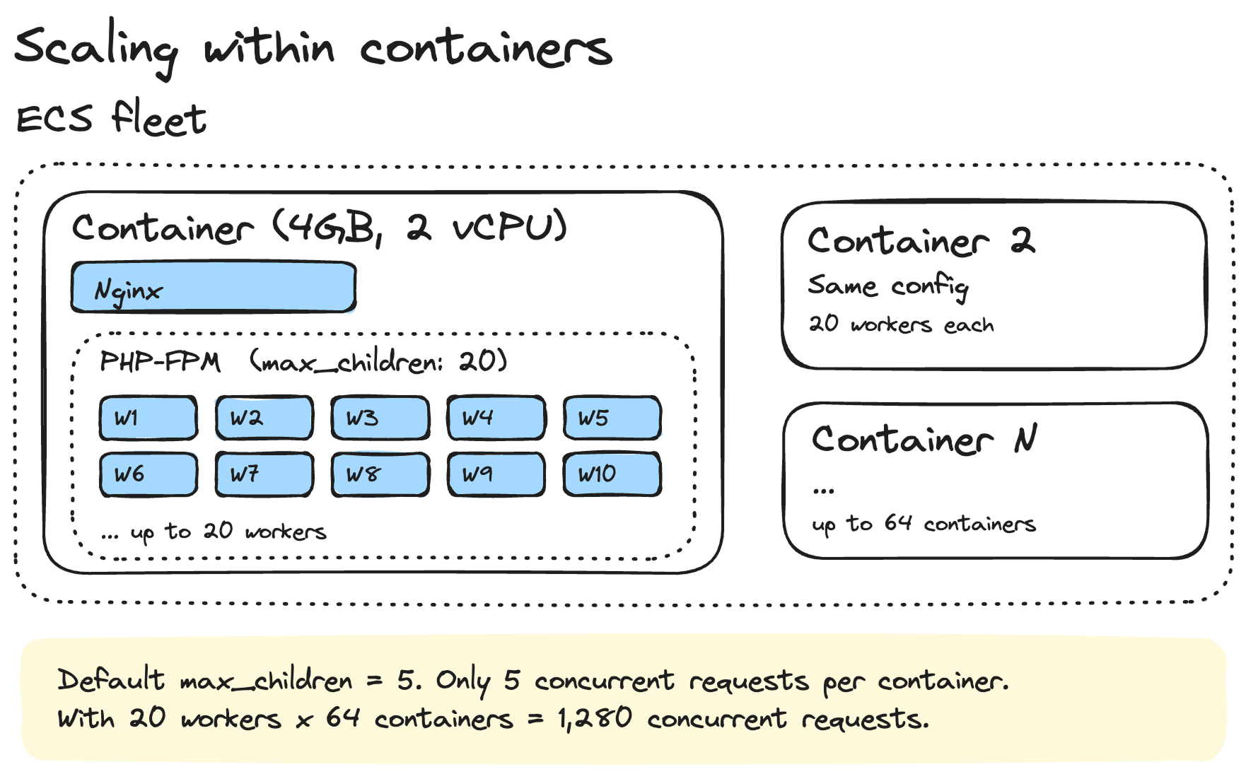 This is something that catches a lot of people off guard. You can have the perfect ECS scaling policy, but if the process manager inside your container is misconfigured, you'll hit a ceiling way before ECS even thinks about adding new containers.