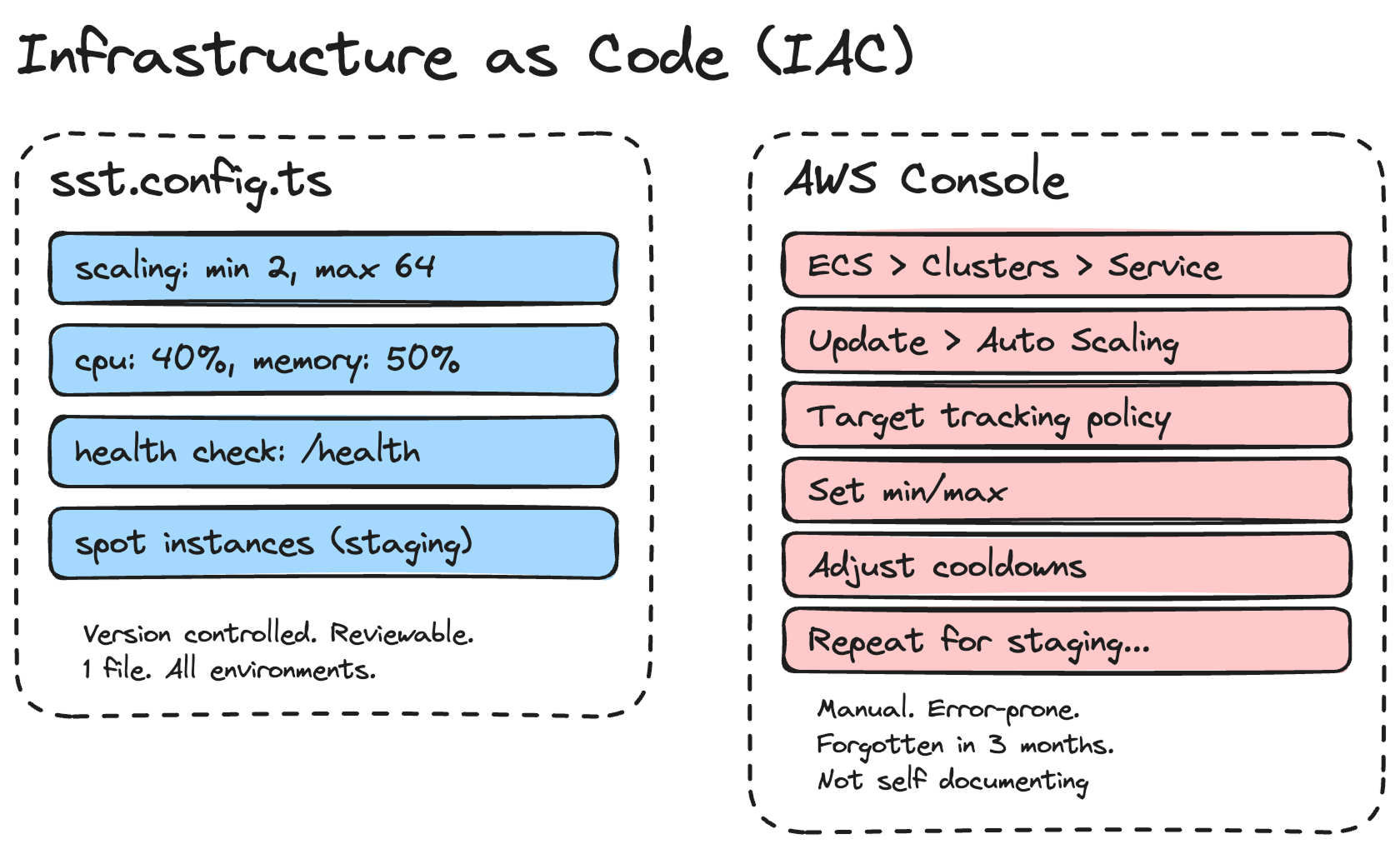With IAC, I can also have different configurations per environment. Staging uses spot instances with a max of 2 containers. Production uses on-demand instances with a max of 64. It's all in one file, version-controlled, and reviewable in a pull request.