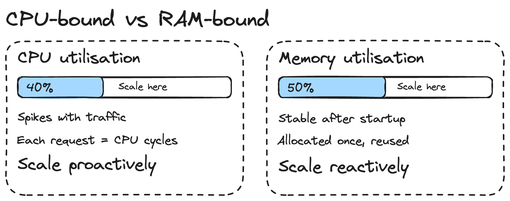 Why lower for CPU? Because when traffic spikes, your CPU is the first to get hammered. Each incoming request needs CPU cycles to process. RAM usage stays relatively stable because your application allocates memory once at startup and reuses it across requests.