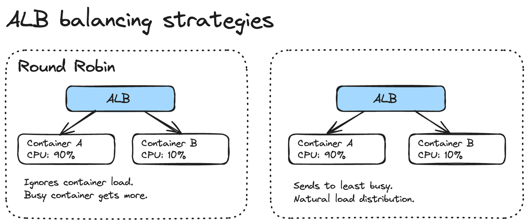 The problem with Round Robin is that it doesn't account for how busy each container is. If one container is processing a heavy request and another is idle, Round Robin will happily send the next request to the busy container. This gets worse with tasks that have variable processing times.